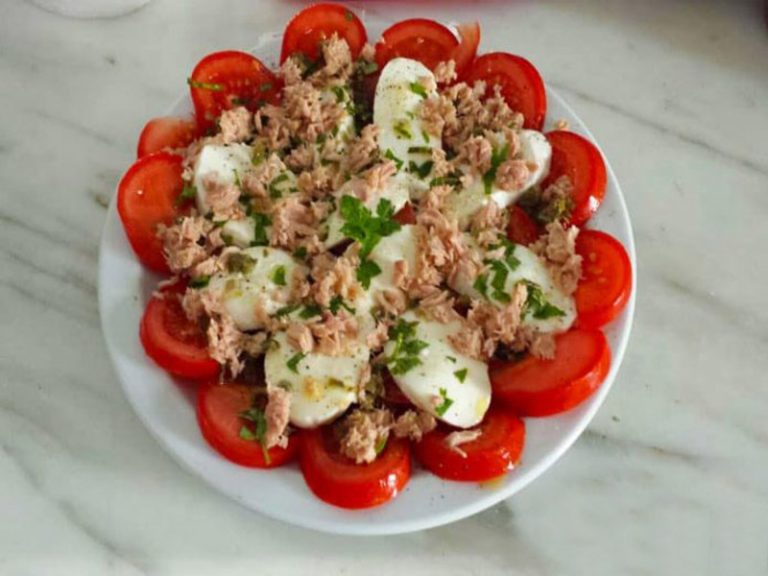 5-6 pomodori sodi e compatti (preferibilmente di Sorrento), 400 g di mozzarella di bufala campana D.O.P., 160 g di pregiato tonno sott’olio, 1 mazzetto di basilico, 2 cucchiai di capperi sotto sale, 3 cucchiai di olio extravergine d’oliva di ottima qualità (45 ml), sale e pepe bianco di mulinello.