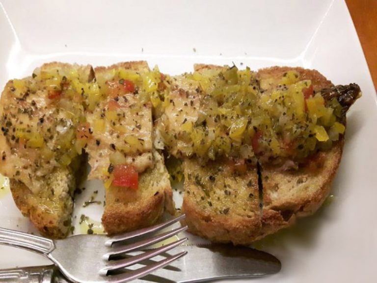 1 confezione di Filetti di sgombro in scatola all’olio di oliva, 12 fettine di pane, qualche pomodorino Pachino, 2 spicchi d’aglio svestiti, 1 peperone giallo, origano q.b., 2-3 cucchiai d’olio extravergine d’oliva, sale, pepe e un pezzetto di peperoncino fresco.