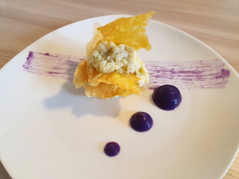Guarnire il piatto con la vellutata di cavolo viola.