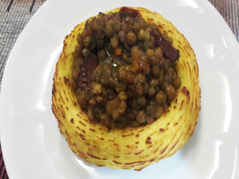 Farcire i nidi di patate con lenticchie e cotechino.