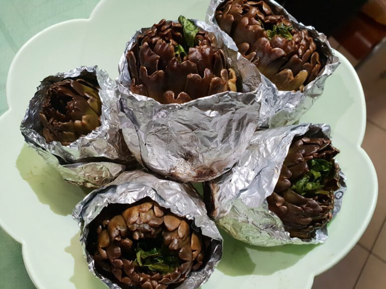 Trascorso il tempo indicato, aprire un cartoccio e verificare se il carciofo è cotto.