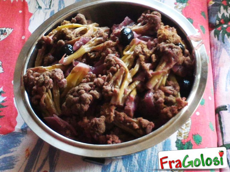 1 grande cavolfiore viola, 1 grossa cipolla, 4 acciughe salate, 50 g di pecorino stagionato a scaglie (o a dadini), 100 g di olive nere, 1 bicchiere di vino rosso, olio extravergine d’oliva, sale e pepe.
