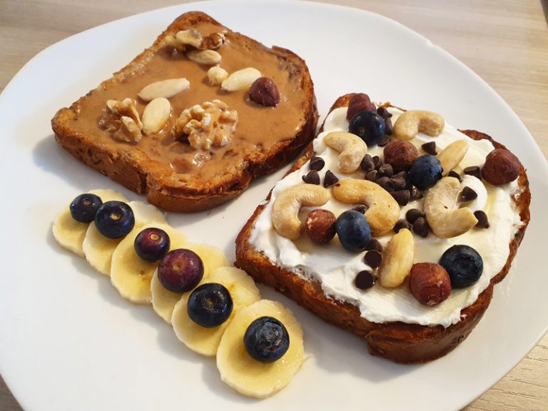 Noi abbiamo guarnito alcuni French toast con crema di mandorle e cocco e con frutta secca ed altri con kefir, sciroppo d’agave e con mirtilli e frutta secca.