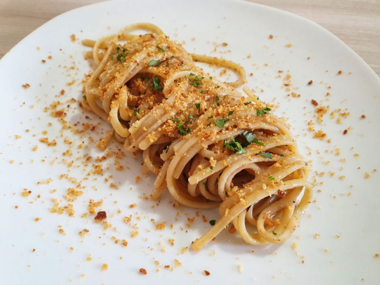 Trasferire le linguine al garum di tonno nei piatti e cospargerle con il pangrattato tostato e con una spolverata di prezzemolo tritato.