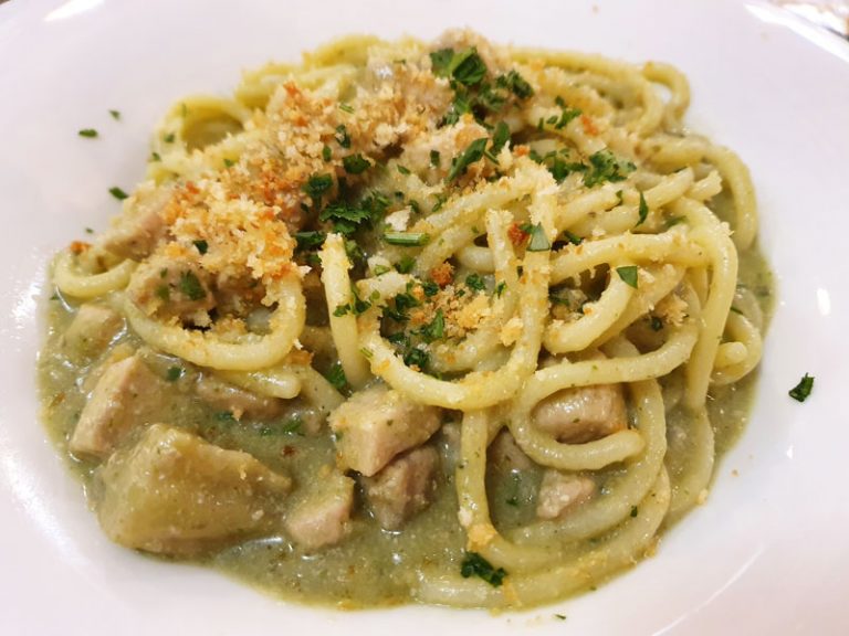 Guarnire con una spolverata di pangrattato tostato e con del basilico spezzettato a mano.