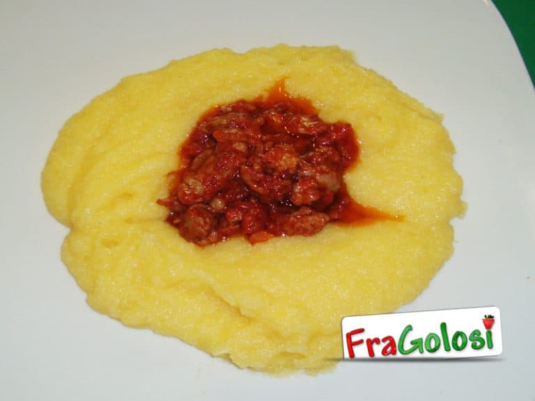 Formare un incavo al centro della polenta e riempirlo con il sugo di salsiccia.