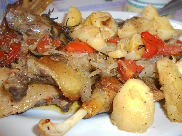 1 anatra media già pulita, 500 g di patate, 12 pomodorini Pachino, 1 rametto di rosmarino, 1 cipolla, 1 foglia di alloro, ½ bicchiere di vino bianco secco, olio extravergine d’oliva, sale e pepe.