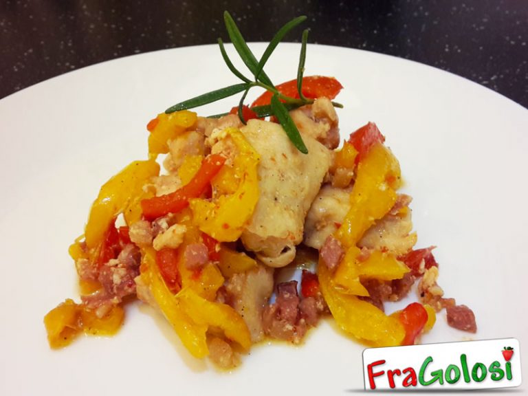 I bocconcini di pollo vengono cotti in padella assieme a speck, peperoni e rosmarino.