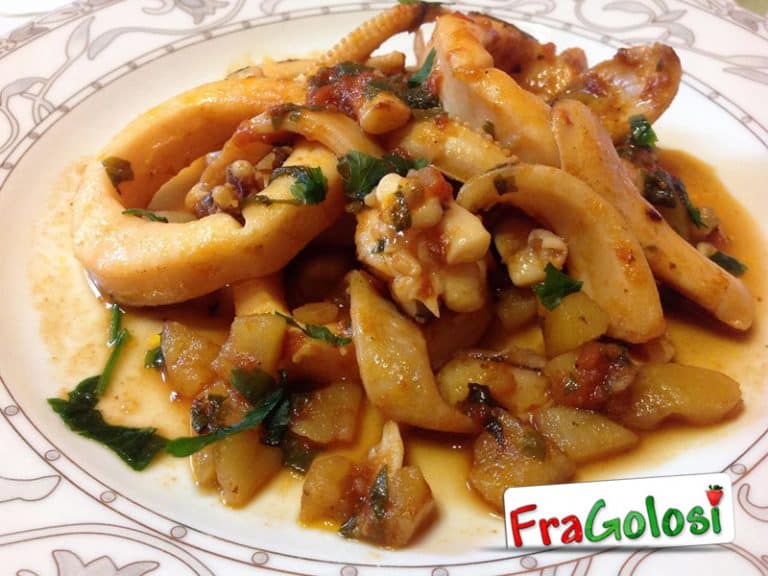 1 kg di calamari tagliati ad anelli, aglio (o cipolla), uno o due pomodori di media grossezza (o 2 cucchiai di salsa già pronta), 400 g di patate, olio extravergine d’oliva, prezzemolo, sale e pepe.