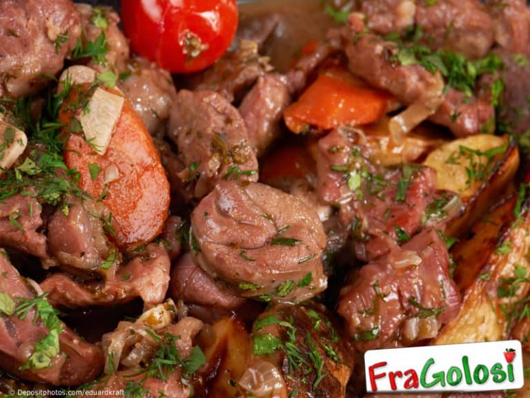 1,2 Kg di capretto, 500 g di patate, due spicchi di aglio, un po’ di prezzemolo, un pomodorino, 1 bicchiere di vino bianco secco, erbe aromatiche a piacere q.b., olio extravergine d’oliva, sale e pepe.