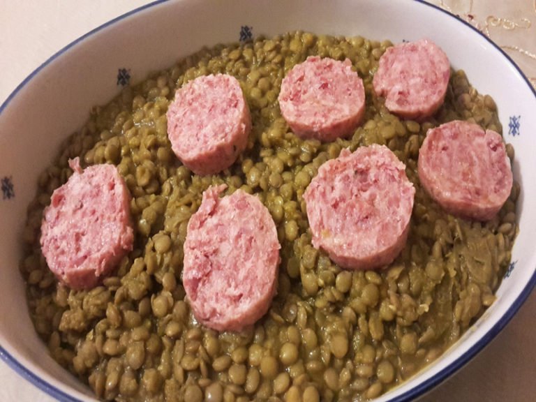 Per il contorno: 350 g di lenticchie, 1 cipolla, 1 costa di sedano, 1 carota, 2 foglie di alloro,1 spicchio d’aglio piccolo, 2 dadi vegetali, 60 ml di olio extravergine d’oliva, sale e pepe.