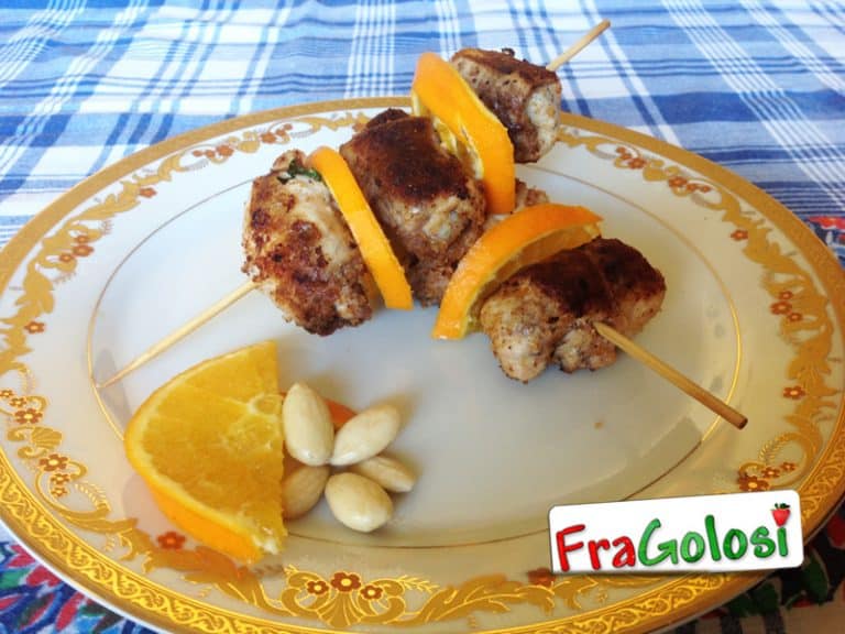 Spalmare il composto sulle fettine, arrotolarle ed infilarle in uno spiedo di legno (quattro o cinque involtini per ogni spiedo).