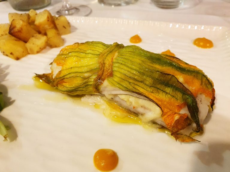 Chiudere con un filetto di spatola con la pelle rivolta verso l’alto e terminare con altri 2 fiori di zucca sovrapposti.