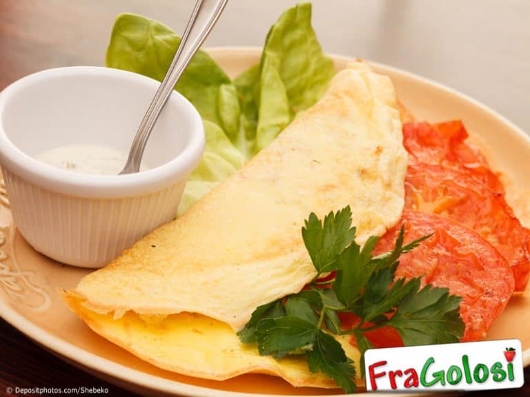 Condire i pomodori a fette con sale, olio ed origano e disporli crudi sull’omelette, che va ripiegata a mezzaluna.