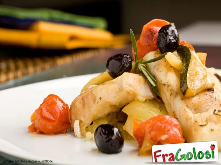 1 orata da 1 kg, 1 bicchiere di spumante (o di vino bianco), 50 g di olive nere, 3 pomodori maturi, 4 filetti di acciuga, farina, 1 spicchio d’aglio, olio extravergine d’oliva, sale e pepe.