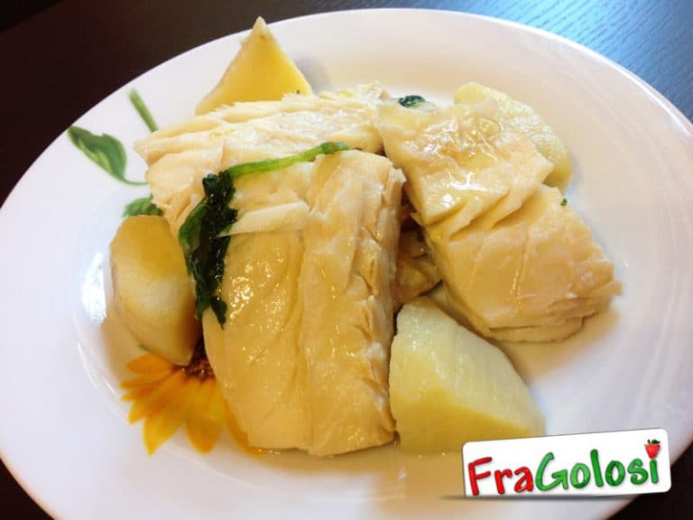 Servire caldo il pesce stocco in bianco con patate.