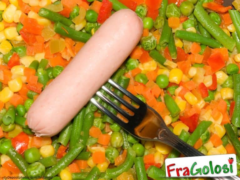 800 g di salsiccia di maiale, preferibilmente con la provola, 1 cipolla, 4 carote medie, 200 g di piselli surgelati, 500 g di fagiolini surgelati, 400 g di pomodori pelati a pezzettoni, ½ bicchiere di vino bianco secco, 1 dado vegetale, olio extravergine d’oliva, sale e pepe.