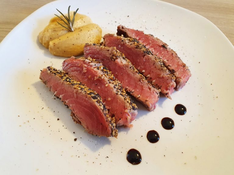 Accompagnare la tagliata di tonno in crosta con delle quenelle di crema di ceci al rosmarino e con gocce di aceto balsamico.